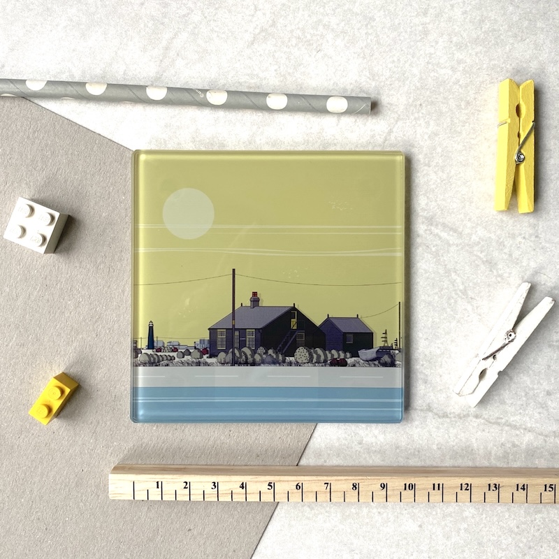 These beautifully made, heavyweight glass coasters feature a stunning illustration of the black but beautiful beach in Kent. These are the ideal gift for the architecture lover in your life, or if you love Dungeness or live in the area. There are 10 designs available in the Glass Coasters section and you can save a bit of money if you choose ‘2 Coasters’ from the list.