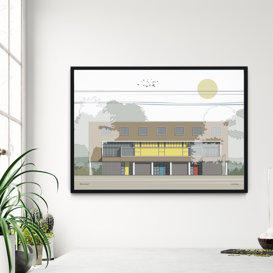The elegant Willow Road giclee print is part of our brand new Dwellings Collection. The print comes in a choice of 2 sizes so by choosing from the options below, you can get the perfect print for your home. Willow Road is terrace of three houses designed by architect Ernő Goldfinger and completed in 1939.