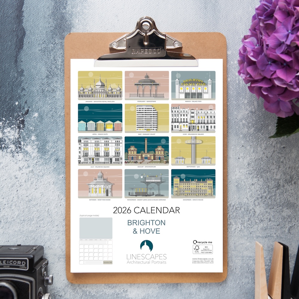 The Brighton & Hove 2026 Calendar features 12 different illustrations of some of Brighton & Hove’s most iconic and architecturally significant buildings.
