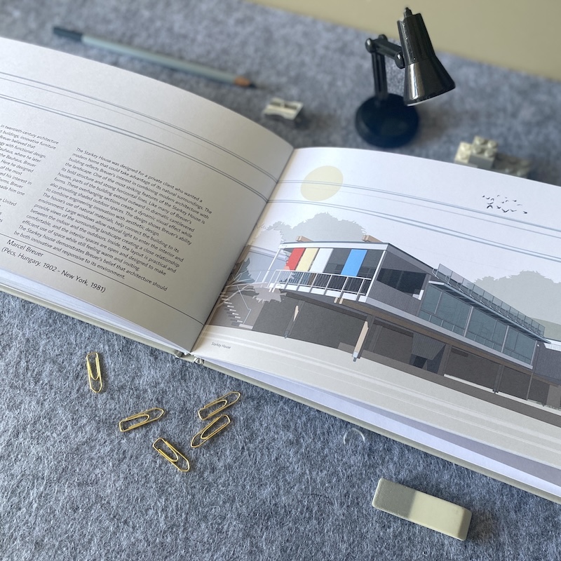 Amalia’s love of architecture and her passion for drawing has inspired her to publish this collection of illustrations of her favourite 20th Century homes. Inside you will find architectural portraits of iconic dwellings such as the Eames House, Rietveld House, the Kaufmann House by Richard Neutra, Villa Savoye by Le Corbusier, Villa Mairea by Alvar Aalto, Isokon flats by Wells Coates and much more! it also includes some of the most interesting bespoke house portraits I’ve carried out in the last ten years such as 22 Parkgate in Blackheath, Outlook in Belfast, and Onslow Court in Worthing among others. 20 of the illustrations inside are now available to buy on my website as greeting cards and Giclee prints, please see other listings or contact me for details. We hope you like them!