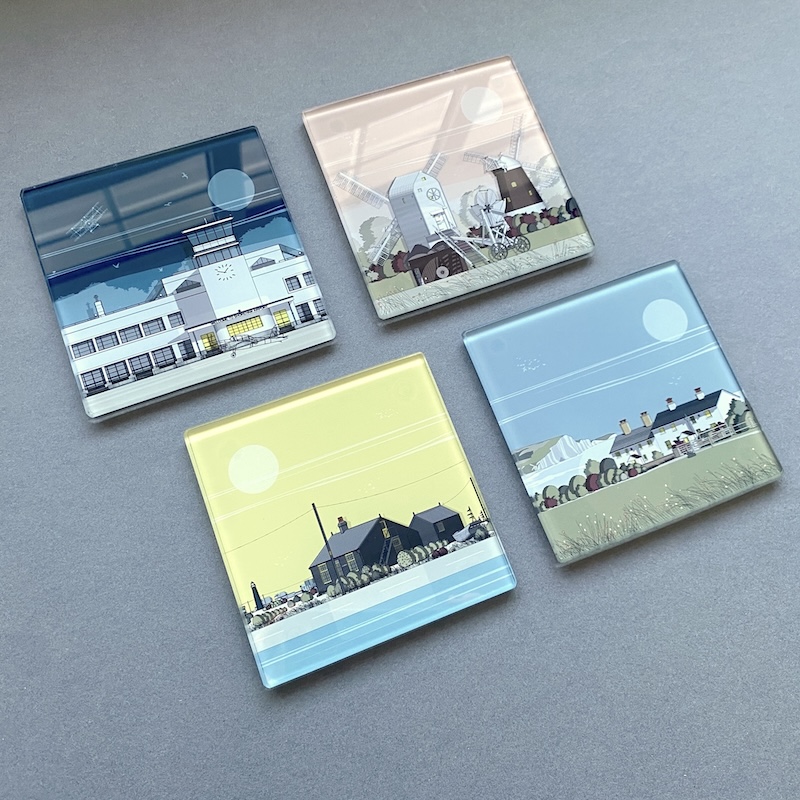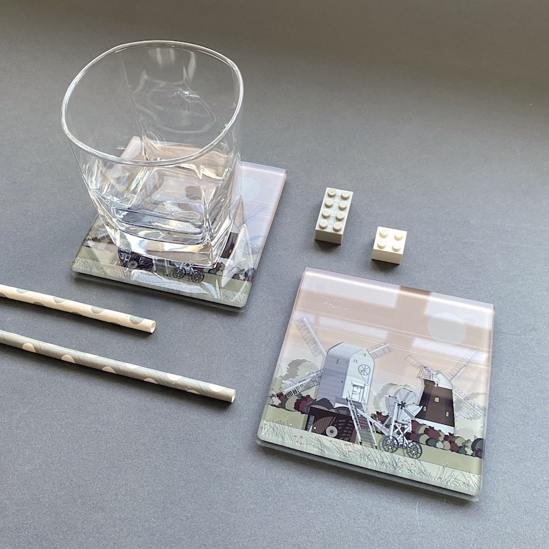 These beautifully made, heavyweight glass coasters feature a stunning illustration of the beautiful Jack and Jill Windmills near Hassocks, East Sussex. These are the ideal gift for the architecture lover in your life, or if you love Sussex or live in the area. There are 10 designs available in the Glass Coasters section and you can save a bit of money if you choose ‘2 Coasters’ from the list.