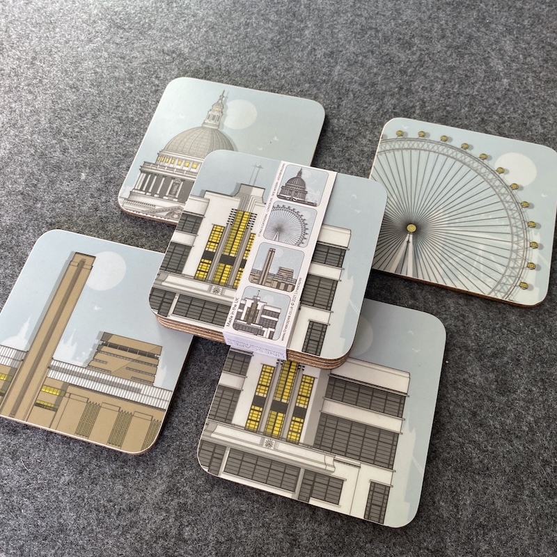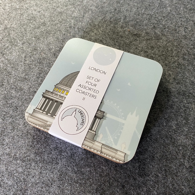 The London Set of Four Coasters includes 4 coasters with illustrations of London’s most recognisable landmarks: St Paul’s Cathedral, London Eye, Tate Modern and Hoover Building.
