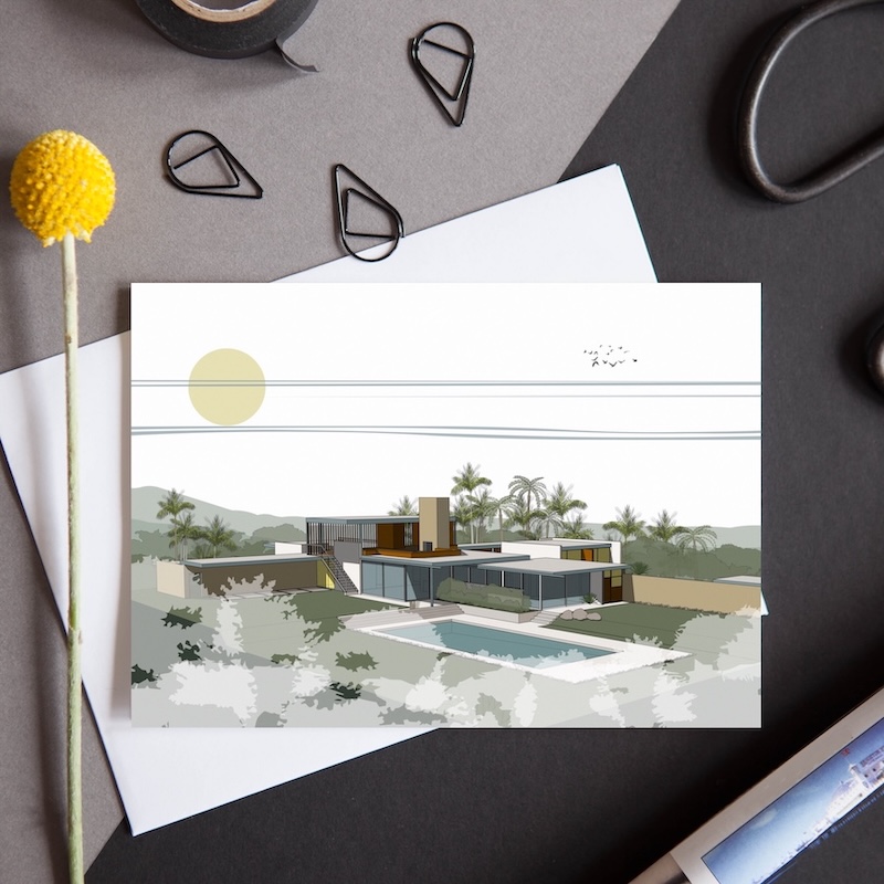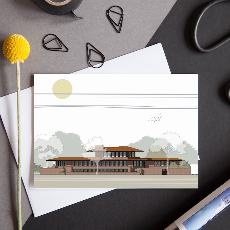 Frank Lloyd Wright’s Robie House card is part of our brand new ‘Dwellings’ Collection. These cards feature illustrations of iconic 20th Century homes and are the perfect gift for the architecture lover in your life, a memento of a trip to this stunning building, or simply for you to keep. Matching giclee print available.