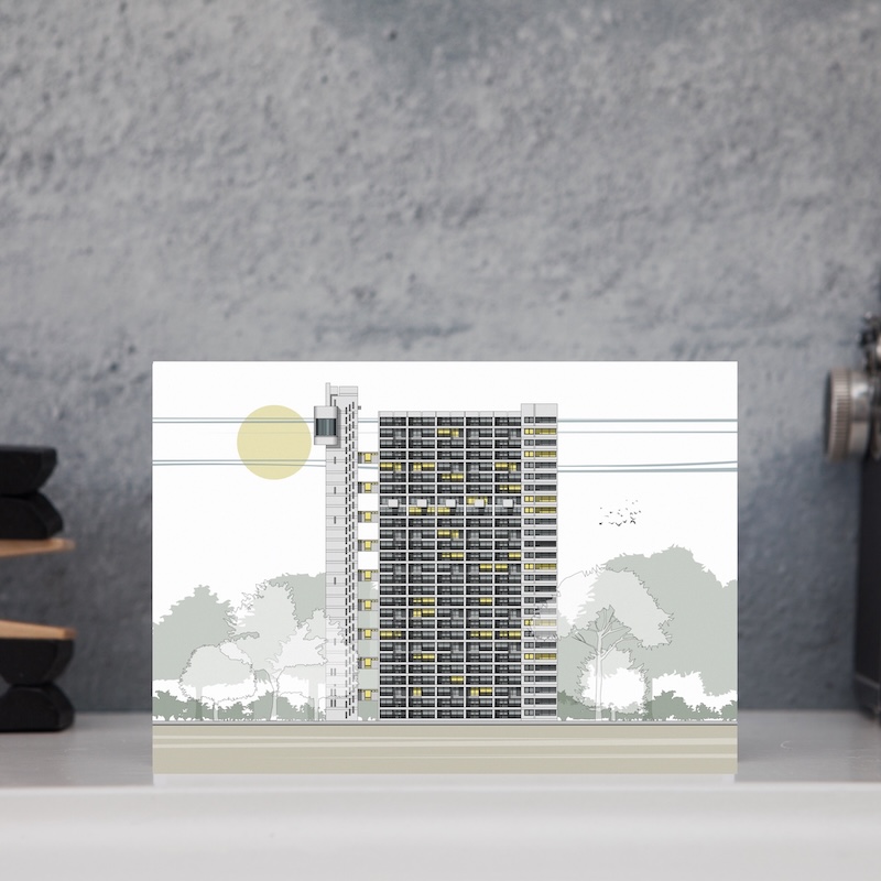 The Trellick Tower card is part of our brand new ‘Dwellings’ Collection. These cards feature illustrations of iconic 20th Century homes and are the perfect gift for the architecture lover in your life, a memento of a trip to this Brutalist building, or simply for you to keep.
